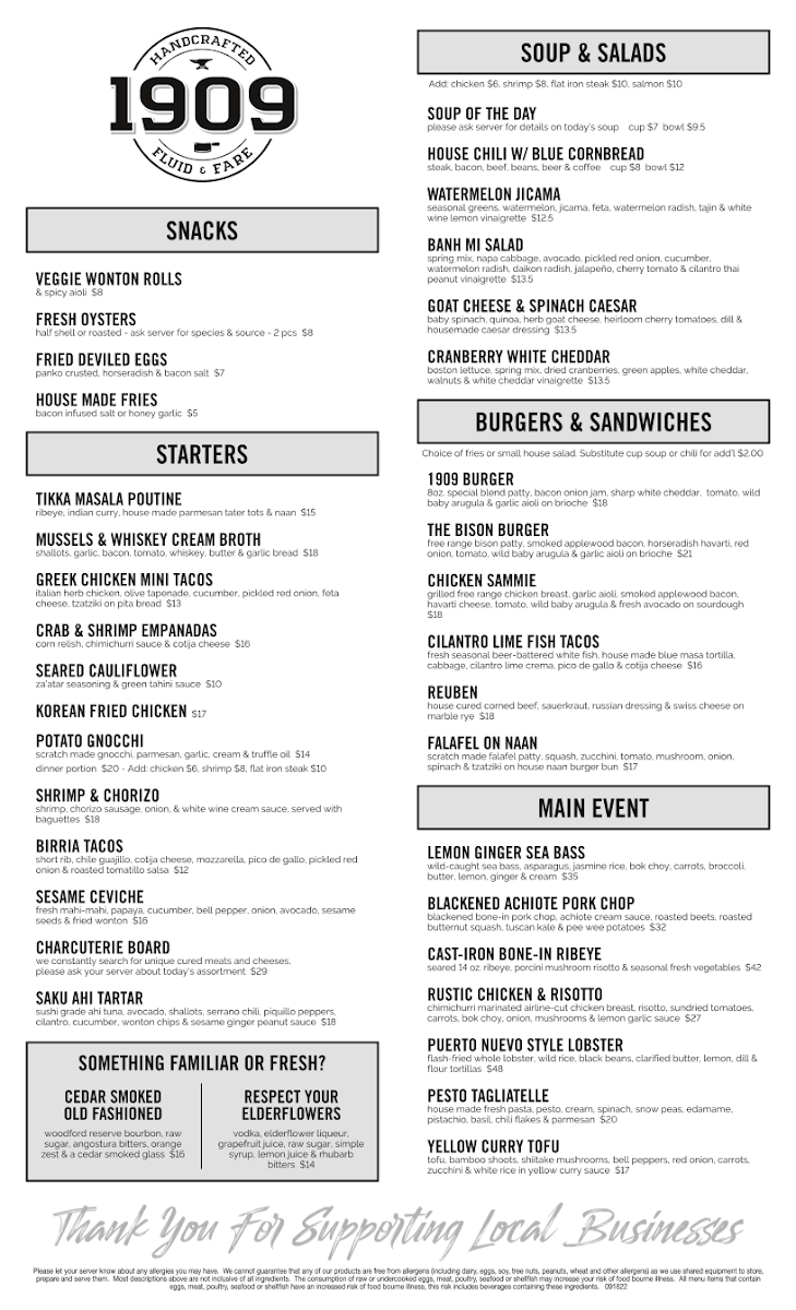 Welcome to 1909 Temecula, a charming gastropub nestled in the heart of Temecula, California. With a focus on fresh ingredients and a community-centric atmosphere, this eatery promises a delightful culinary experience. The menu showcases enticing options like the Banana Kahlua French Toast and the Rolled Blueberry Coconut French Toast, both perfect for brunch enthusiasts. For those looking to share, the Charcuterie Board offers a curated selection of unique cured meats and cheeses that change daily.